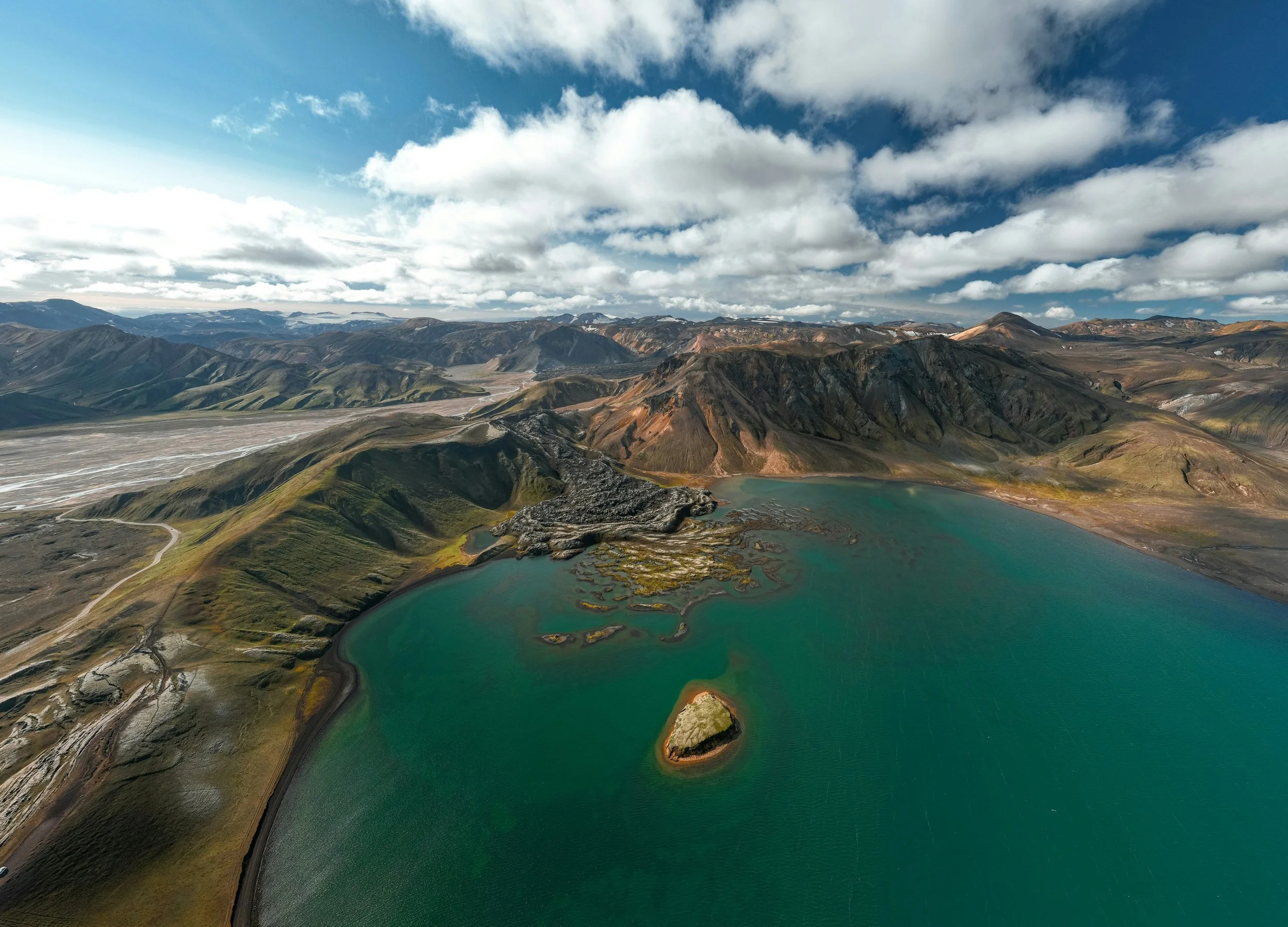 The route continues through colorful volcanic terrain marked by crater lakes and rhyolite hills, including the serene shores of Frostastaðavatn, where the still waters reflect the surrounding mountains in striking clarity.